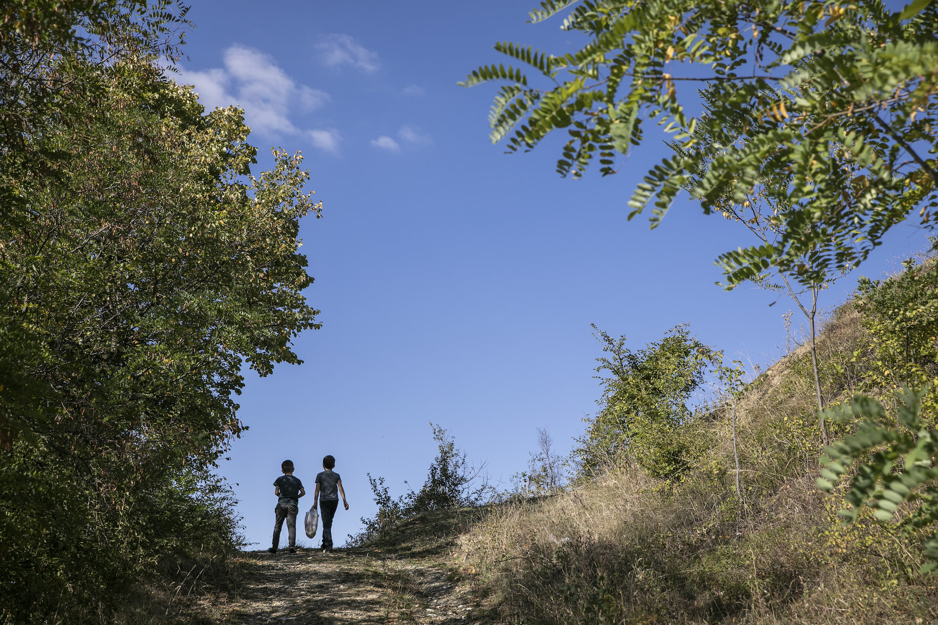 Two young boys walk through the empty streets of Leskovec.