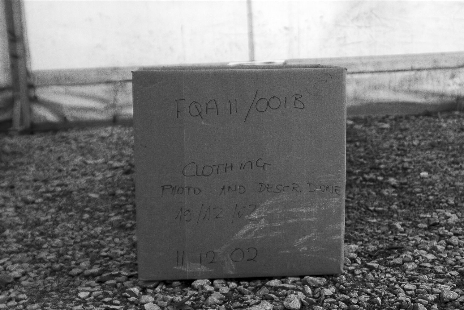 A cardboard box in the missing persons transfer tent in Merdare, containing personal belongings of a person who was found in a mass grave in Serbia. Photo: Ferdi Limani, 2006.