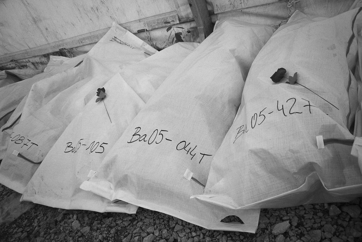 Plastic bags containing mortal remains of missing persons from Kosovo displayed in the missing persons transfer tent at the Merdare border crossing point. Photo: Ferdi Limani, 2006.