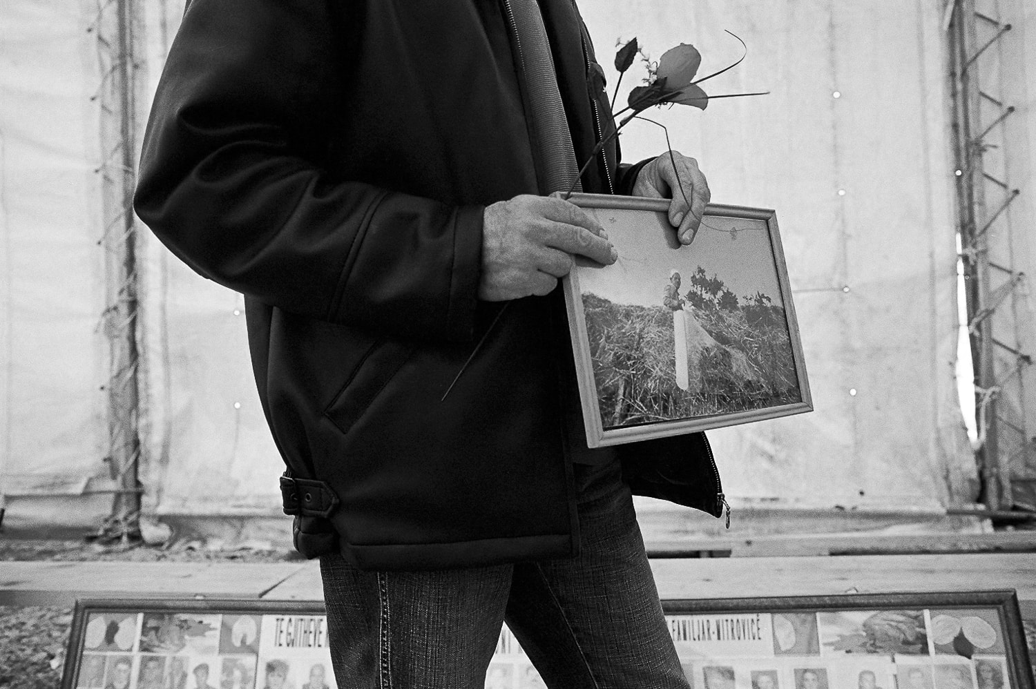A family member of a missing person holds a framed photograph of his relative during the handover ceremony of mortal remains at the Merdare border crossing point. Photo: Ferdi Limani, 2006.