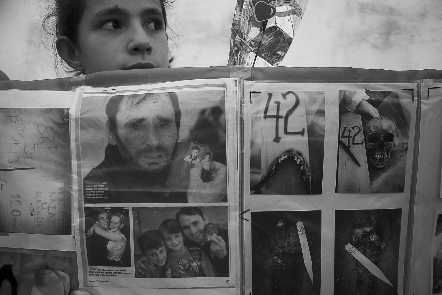 A young girl stands by a poster with photographs of missing persons at the Merdare border crossing point during the handover ceremony of 110 bags containing mortal remains of war victims. Photo: Ferdi Limani, 2006.