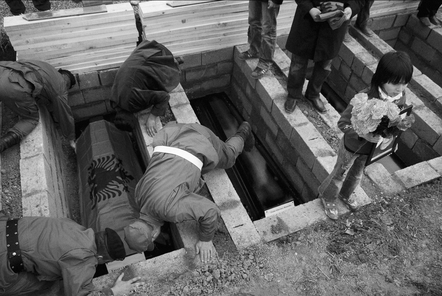 A young girl holds flowers as members of the Kosovo Protection Corps bury the coffin of a war victim at the reburial ceremony of 21 war victims in Krusha e Madhe. Photo: Ferdi Limani, 2007.