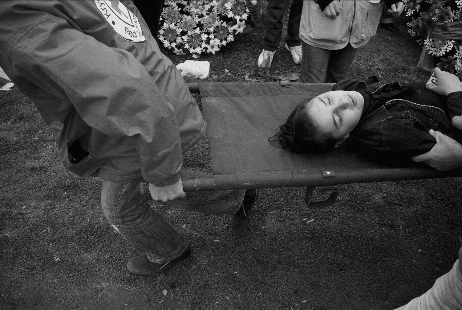 A young girl is transported to an ambulance as she loses consciousness at the reburial ceremony of 21 war victims in Krusha e Madhe, near Prizren. Photo: Ferdi Limani, 2007.