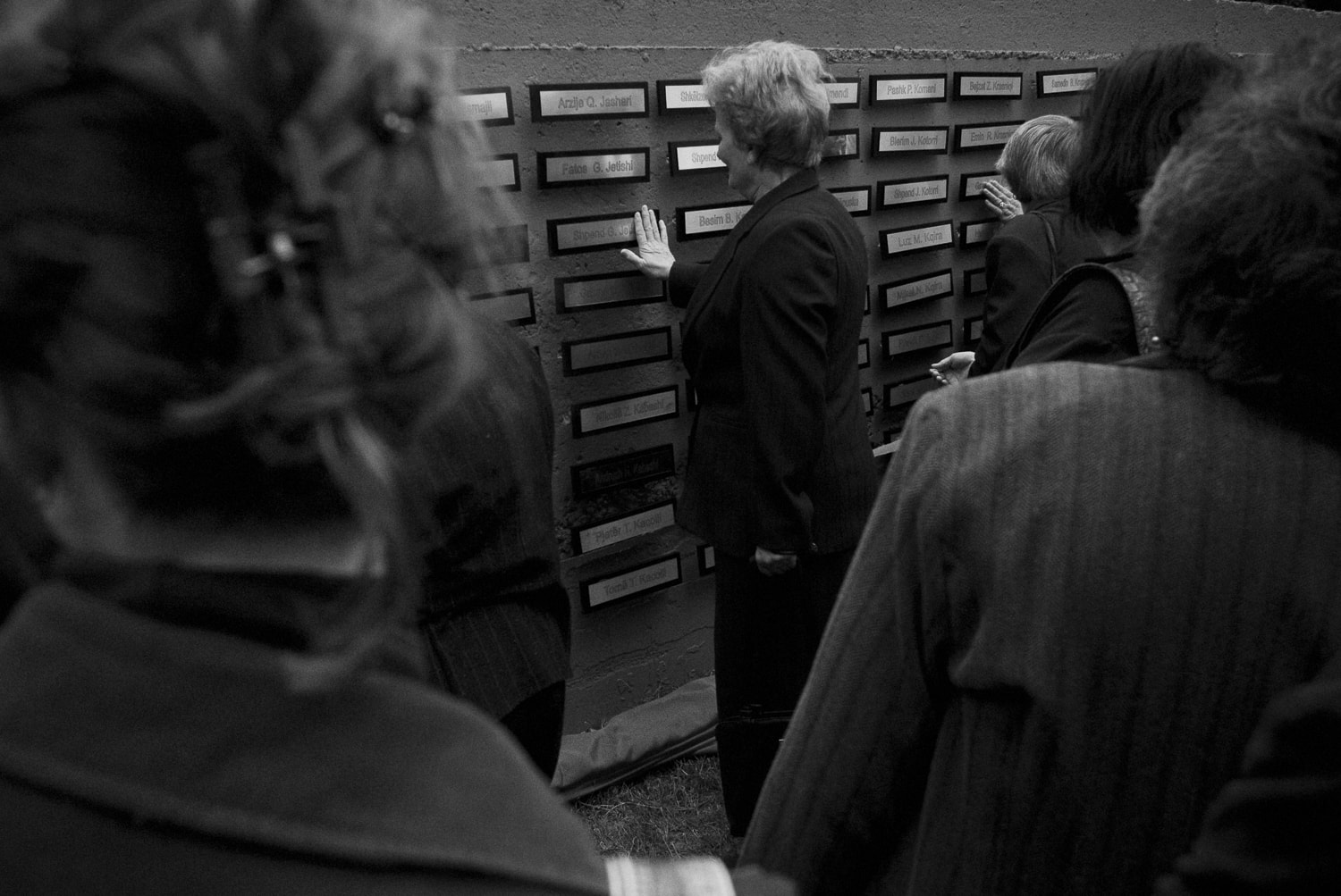 Mothers of missing persons in Gjakova find plaques bearing the names of their loved ones on the ‘wall of pain,’ which contains the names of missing persons. Photo: Ferdi Limani, 2008.