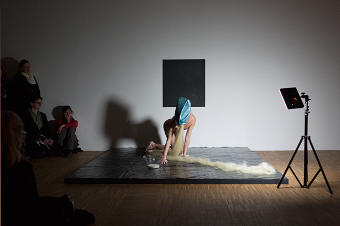 In “Unikat,” an audio-visual performance, Ismaili constructs three figures with “futuristic and alien characteristics,” including a pregnant boy. Photo by Matevz Paternoster / courtesy of Astrit Ismaili.