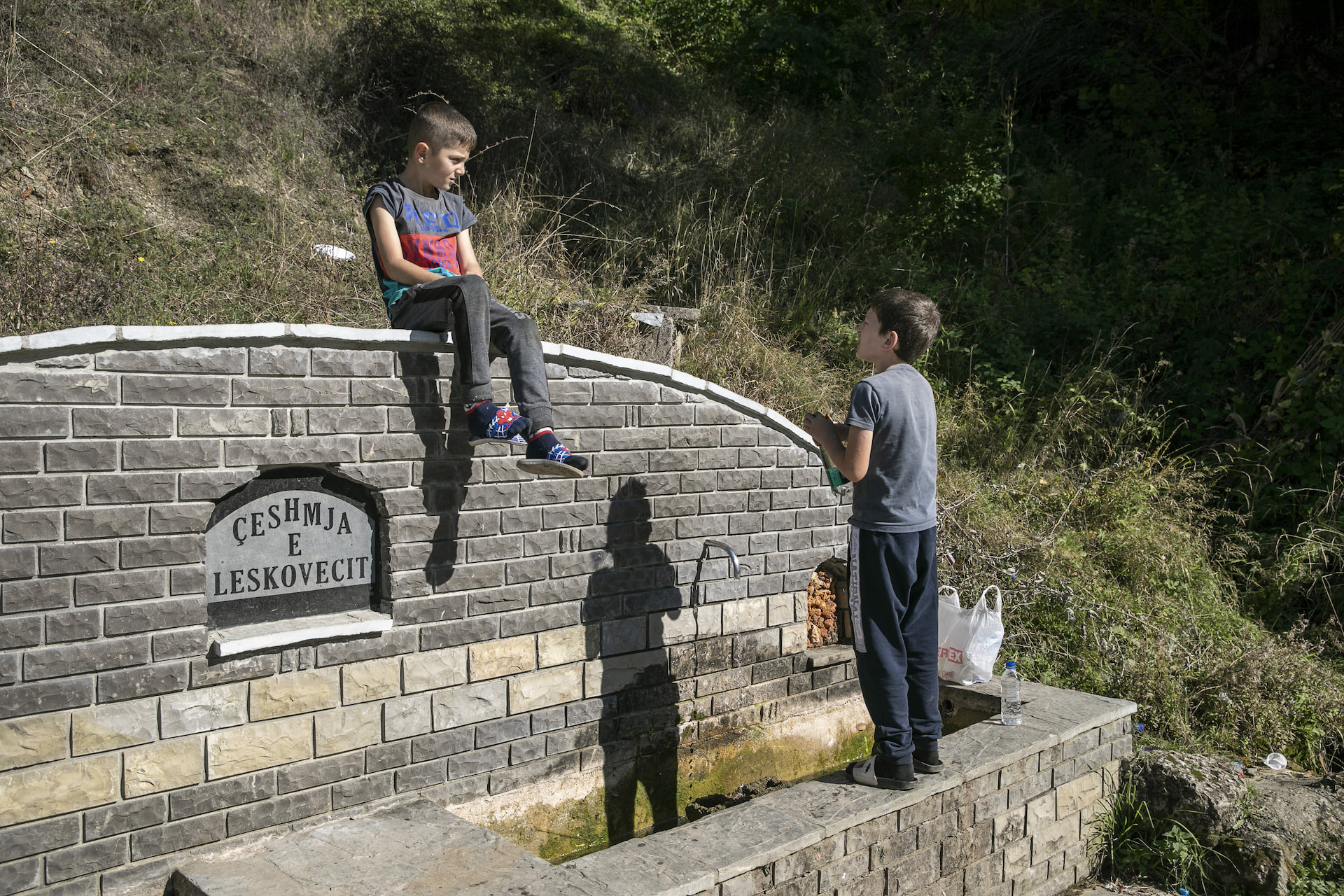 Two boys fill bottles with drinking water from the fountain of Leskovec.
