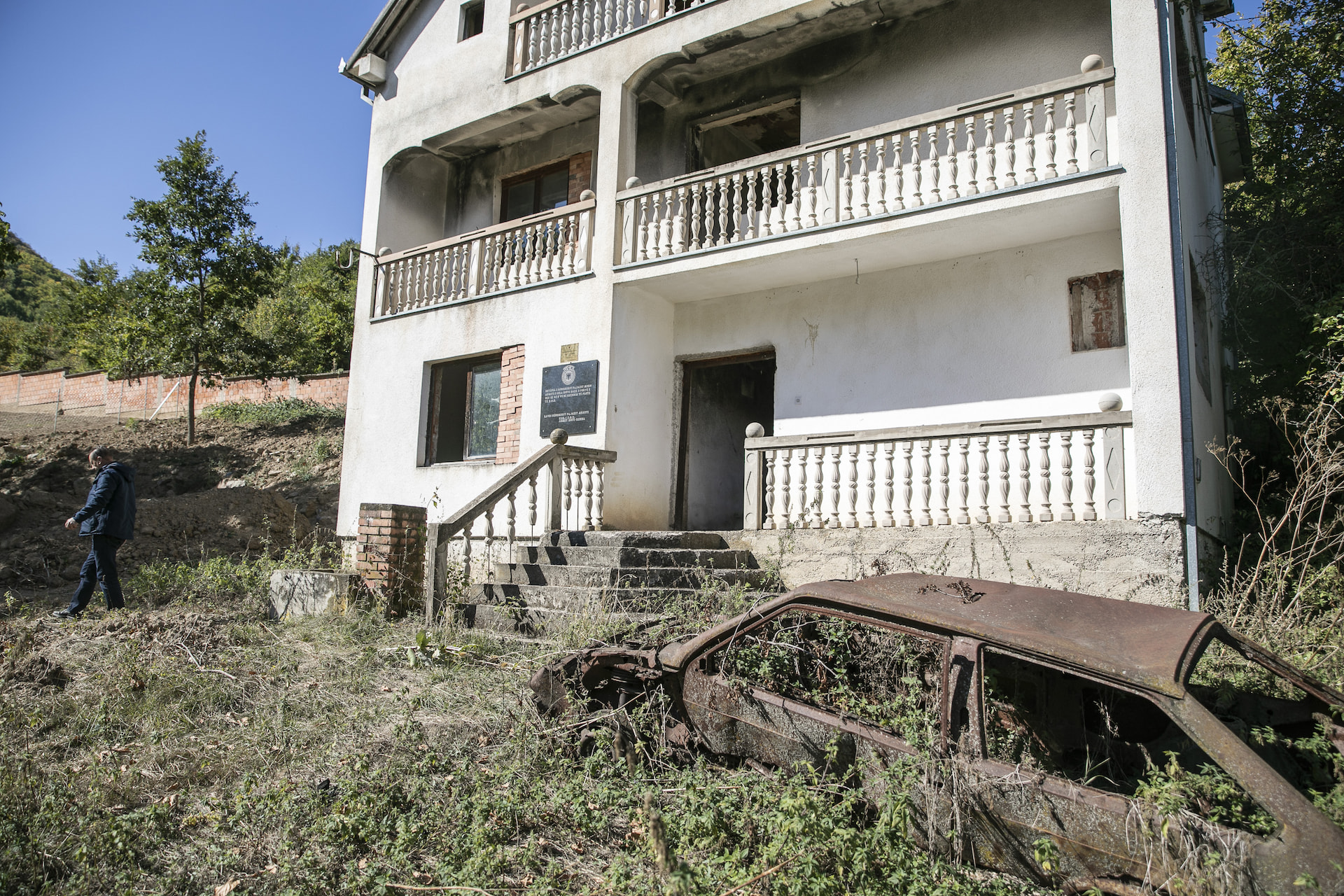 While waiting for the arrival of the excavator man, Osman told me about his native village. As we walked near the abandoned houses, I entered one and could see that there were still signs of gun shooting in the living room. We both escaped from the sun under the shade of a walnut tree located right in the middle of a property belonging to the family of the martyr Pajazit Ahmeti-Paja. There were two war-damaged houses, and next to one was a one-story house with a very clean courtyard still used for infrequent weekend visits.