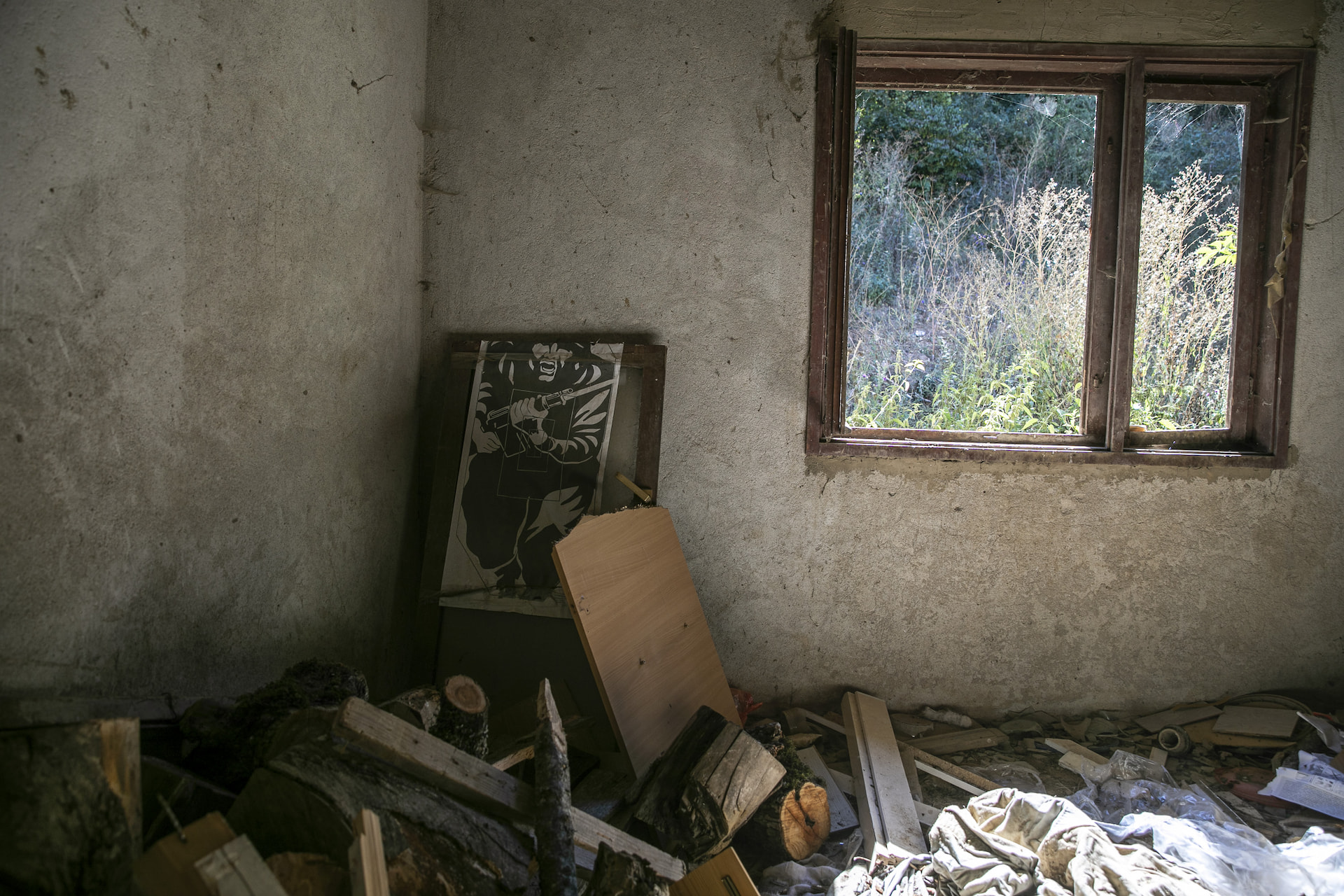 Signs of gunfire in the living room of an abandoned house in Zhegrovc.