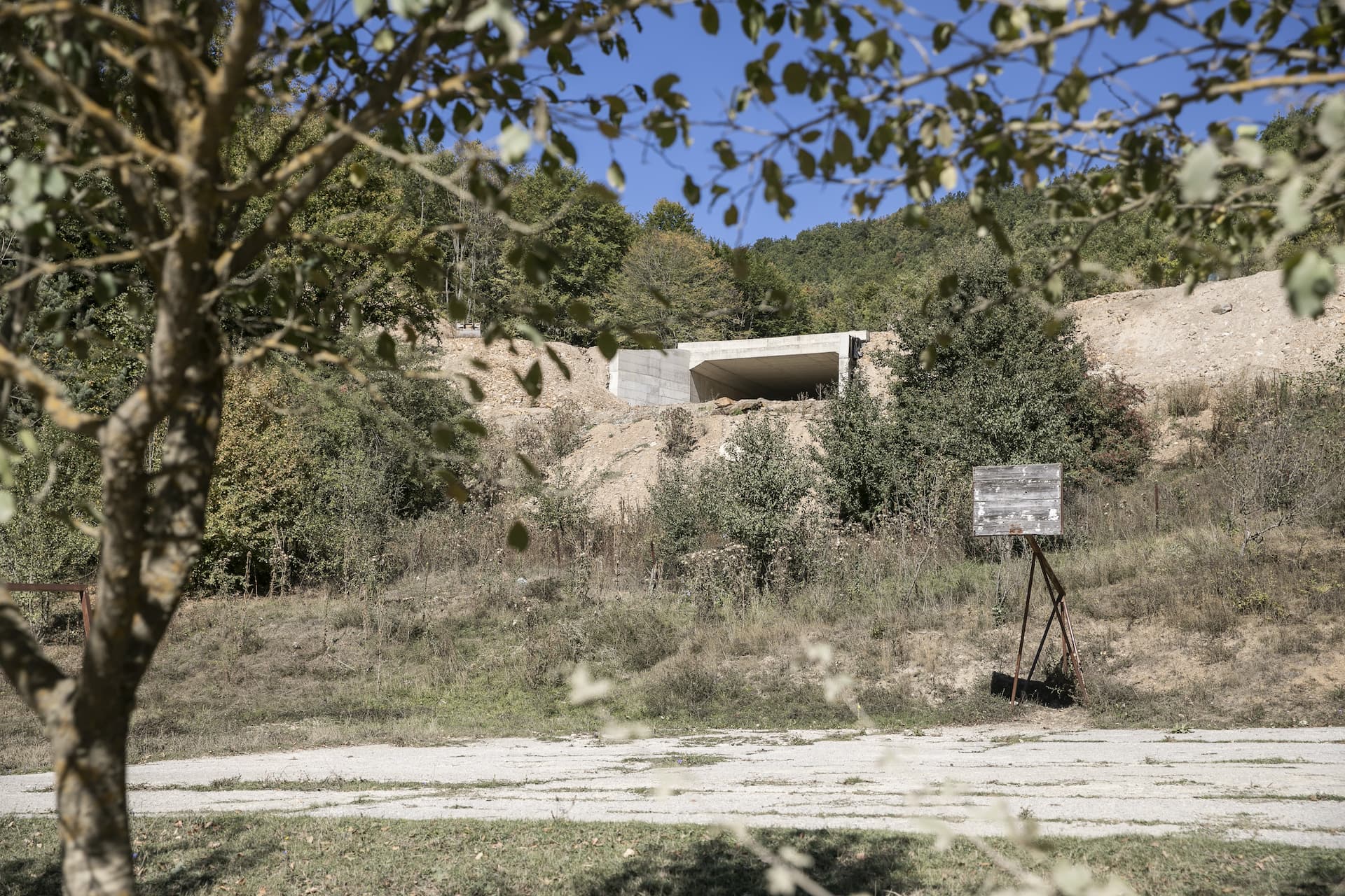 Rruga e asfaltuar papritmas ndërroi dhe u shndërrua në rrugë malore të shfrytëzuar nga makineritë e rënda të cilat bartnin material për projektin e ndërtimit të autostradës. Pasi pluhuri u qetësua dhe hapi rrugë, u ndala në shkollën e fshatit. Oborri i braktisur i shkollës kishte ende gjurmë këmbësh të fëmijëve. Zhurma e cicërrimave të zogjëve papritmas u ndërpre nga zhurma e makinerisë ndërtuese të autostradës e cila kishte prerë malin sikur me dorë.