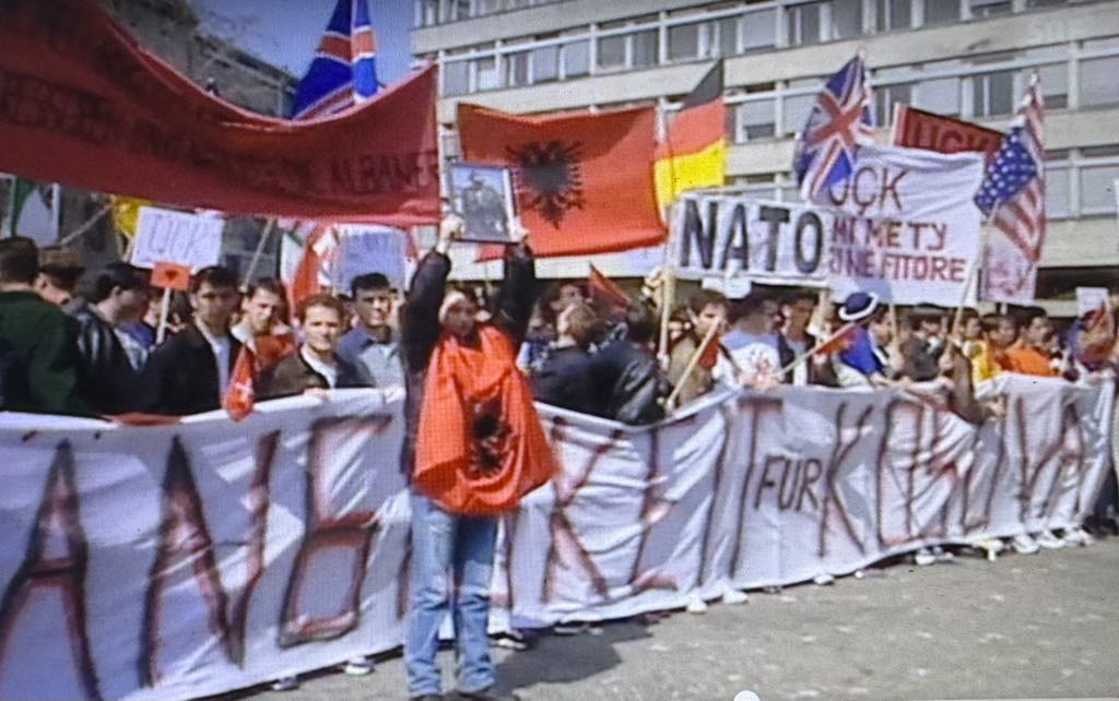 Anëtarë të diasporës kosovare në Zvicër, duke protestuar në pranverën e vitit 1998 në Cyrih kundër luftës që sapo kishte shpërthyer në Kosovë. Fotografia nga arkivi i Osman Osmanit.