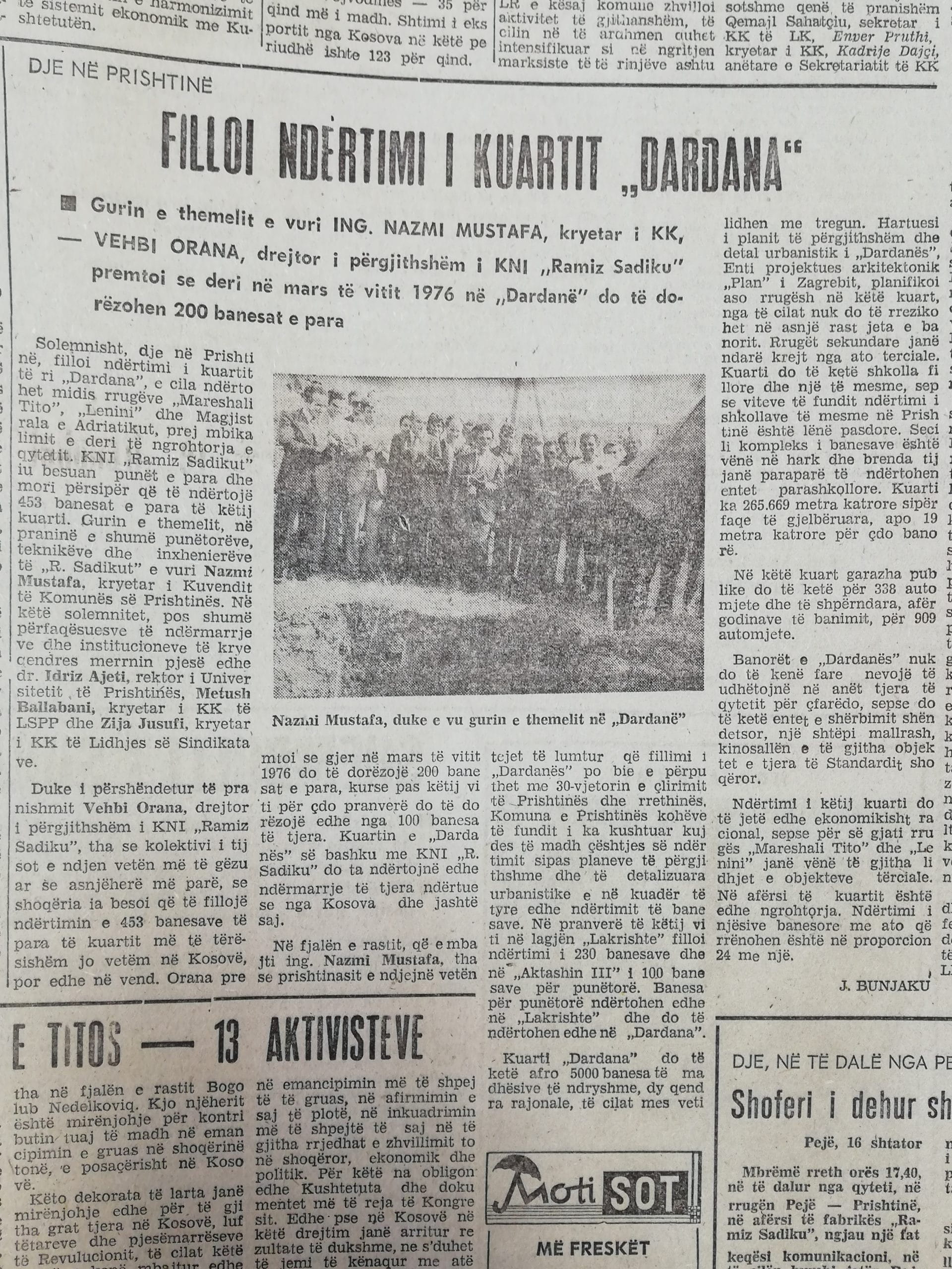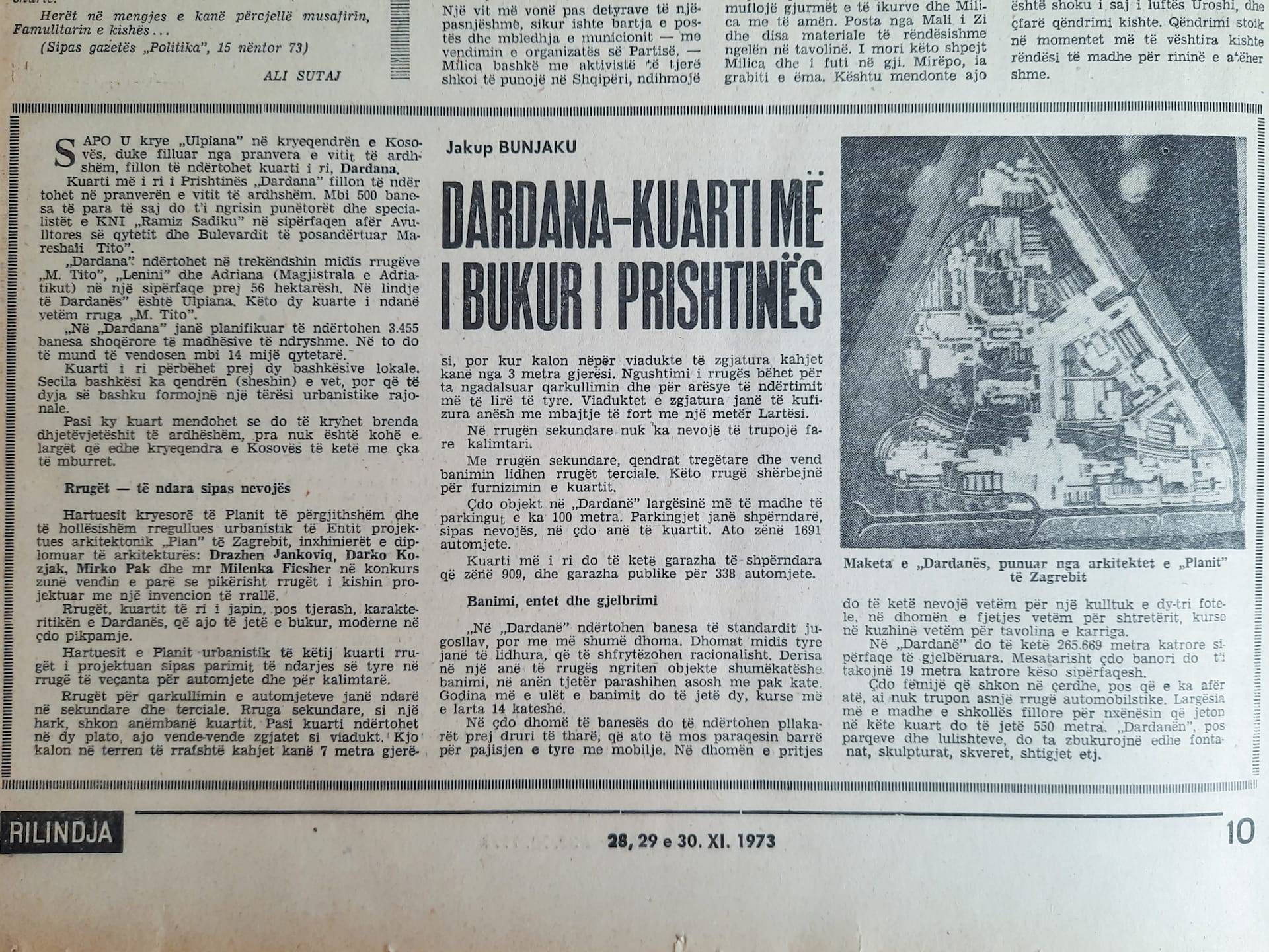 Članak objavljen u Rilindji 1974. godine, kada je položen kamen temeljac za izgradnju Dardanije.